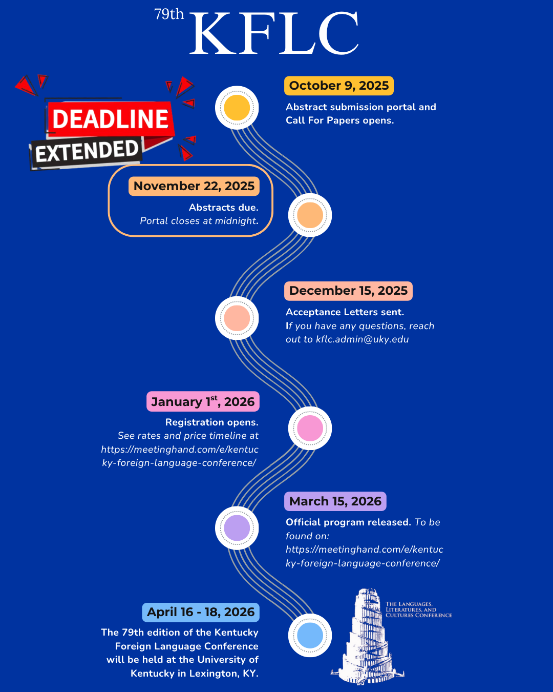 The Kentucky Foreign Language Conference (KFLC) invites submissions for papers and panels for its 2026 edition. This year’s conference will be hybrid, with virtual panels on Thursday, April 16 and in-person sessions on Friday and Saturday, April 17–18.