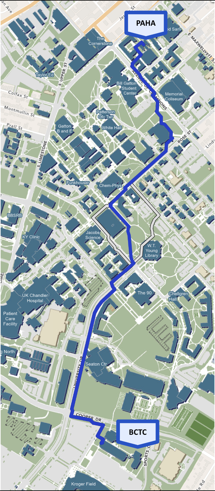 Map from Patterson Hall to Bluegrass Technical Community College: